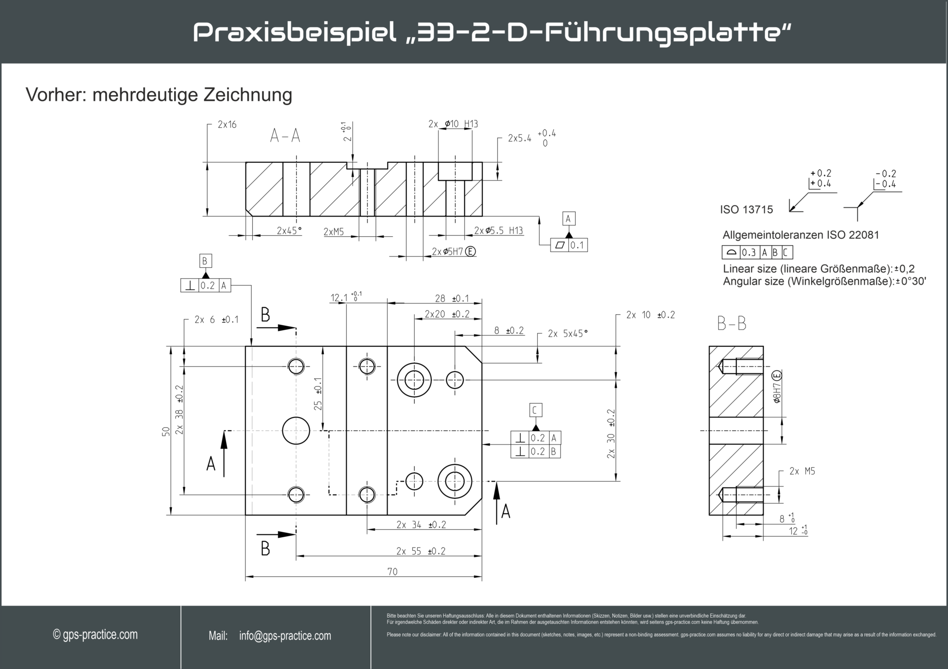 In einem Vorher-Nachher-Vergleich wird gezeigt, wie eine zunächst mehrdeutige Zeichnung in eine ISO-GPS-konforme und damit funktionsgerechte Darstellung überführt wird. Dabei werden unter anderem Fügeabsichten durch eindeutige Spezifikationen sichtbar gemacht. So wird nachvollziehbar, welche negativen Auswirkungen